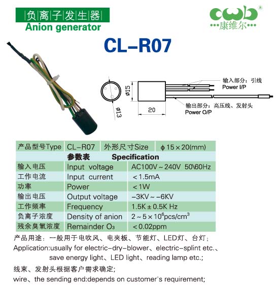 Product Name : Anion generator for hair dryer and energy-saving lamp in AC Model No. CL-R07 size: Ø15 x 20 (mm)